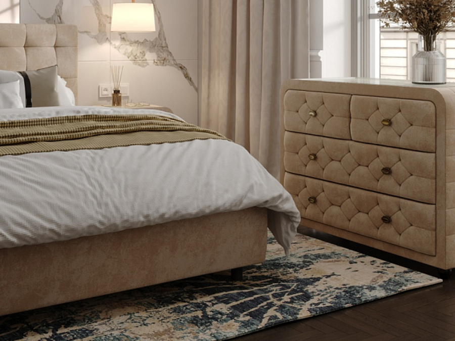 Современный многофункциональный комод Flavio на аккуратных ножках с четырьмя вместительными выдвижными ящиками на скрытых направляющих с доводчиками, которые обеспечат плавное и бесшумное закрытие.