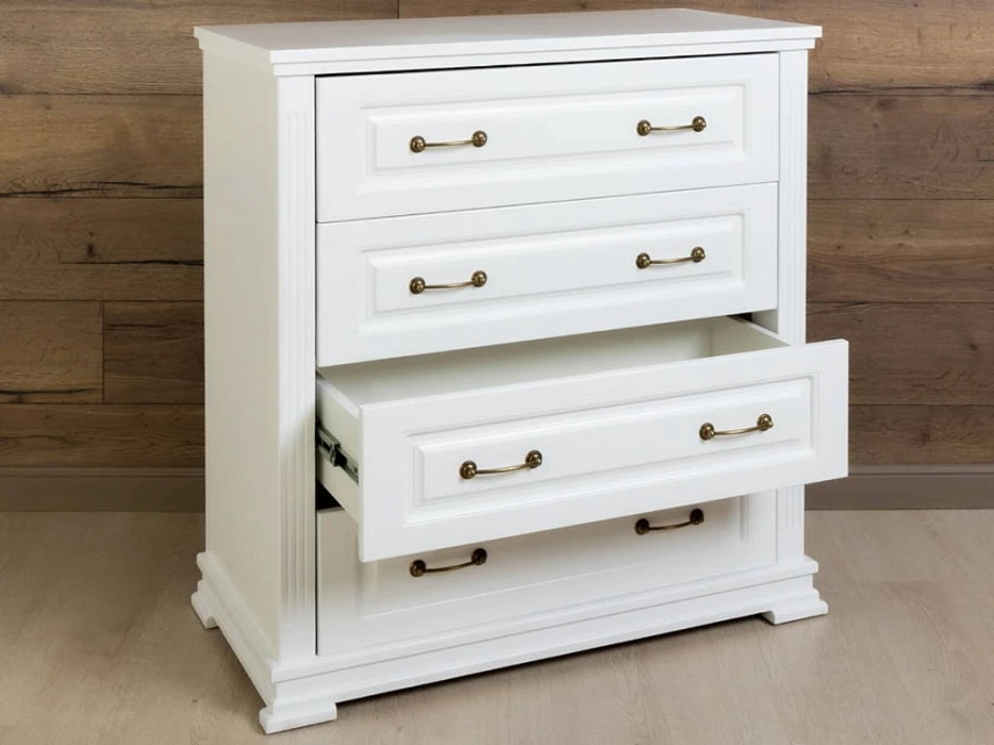 Milena - комод для тех, кто выбирает мебель один раз и надолго. Каркас и фасады из натурального массива, защитное лаковое покрытие, которое проявляет неповторимую текстуру дерева и никакой бумажной плёнки, которая вздувается через год. Четыре глубоких ящика на шариковых направляющих полного выдвижения делают хранение удобным, а вес 61 кг. говорит о плотности материала без лишних слов.